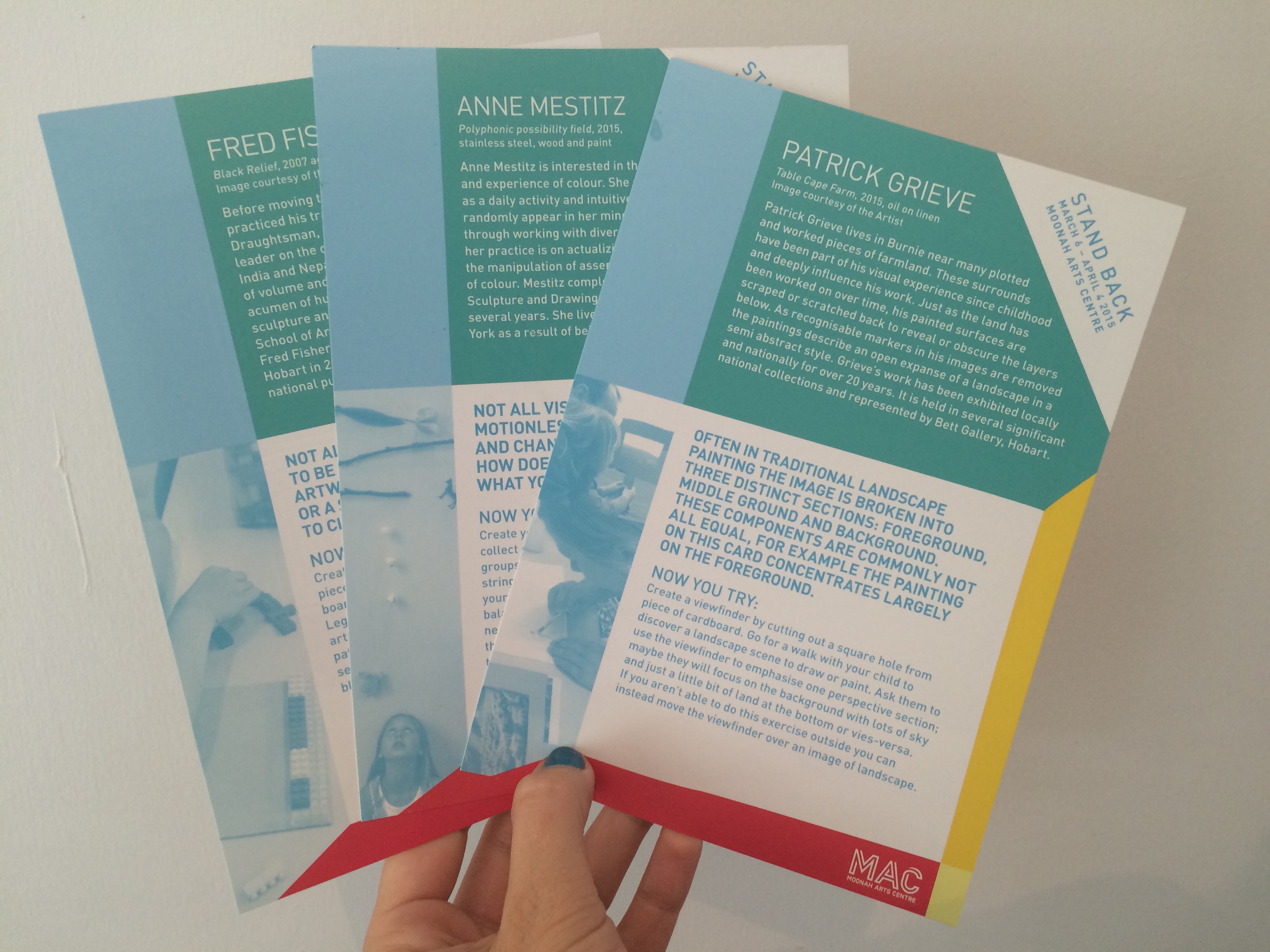 The gallery catalogues are what impressed me most, perfectly considered for the young viewers. These beautifully presented little books come apart to form a series of cards (one for each artwork). On the back of each artwork there is simple accessible information about that work, what the artist was trying to achieve – and even additional information about something the child might like to try themselves.