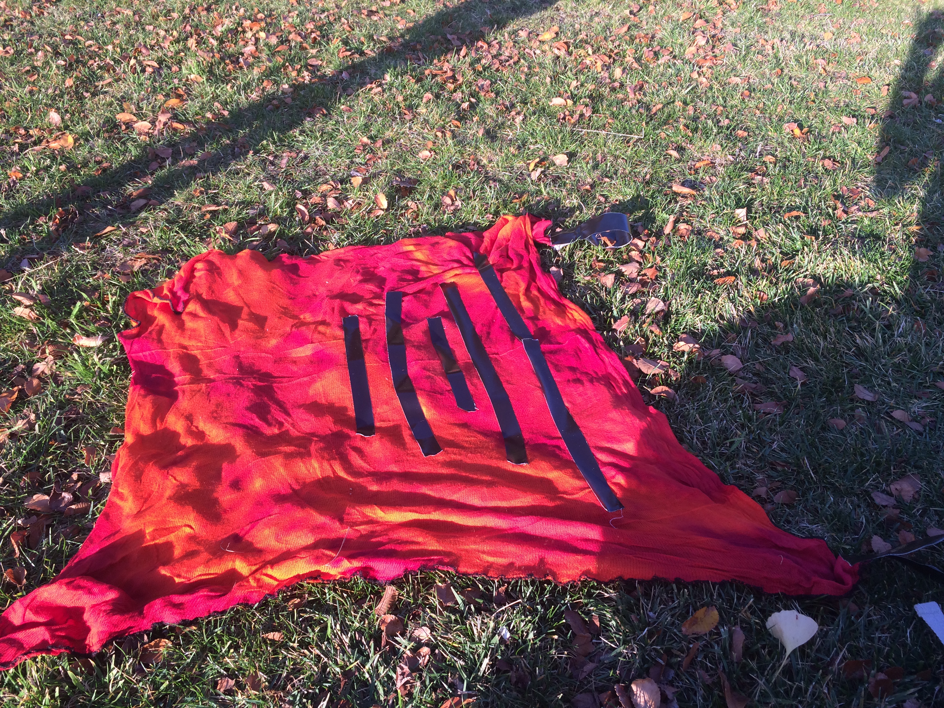 Once decorated, gather the center of your square (bringing the center of the top and the center of the bottom to the middle of the fabric) so you have 2 triangular wings on either side of your gathering. Secure your gathering with the tape (or sew if you are making a more permanent set of wings)