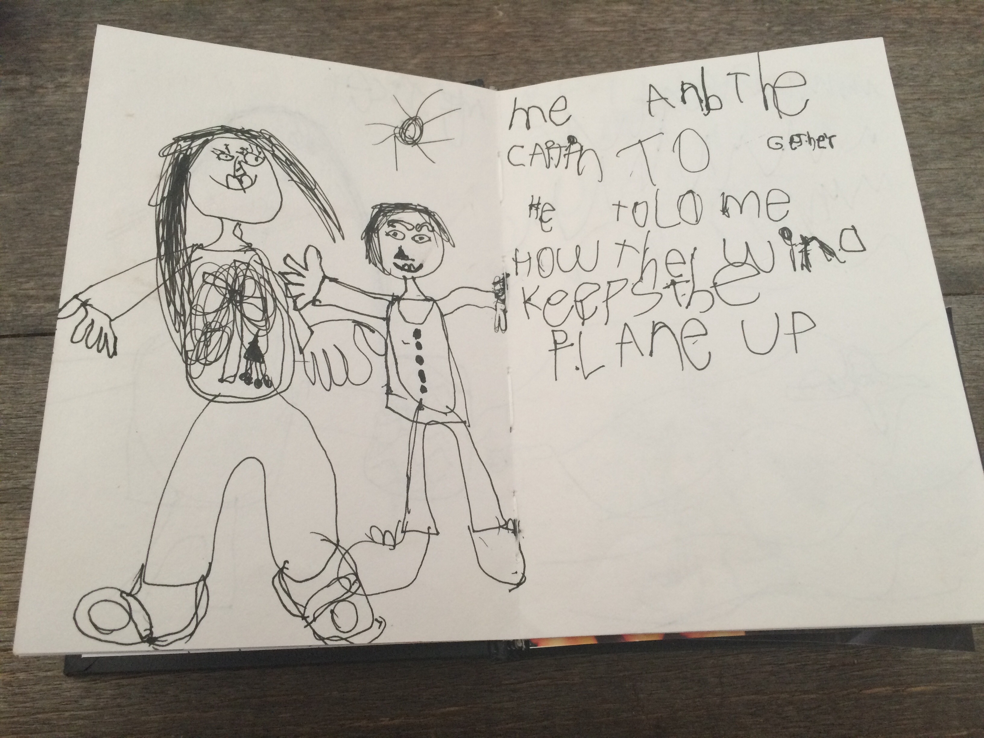“Me and the Captain together. He told me how the wind keeps the plane up” drawn by Anica just after her visit to the pilot.