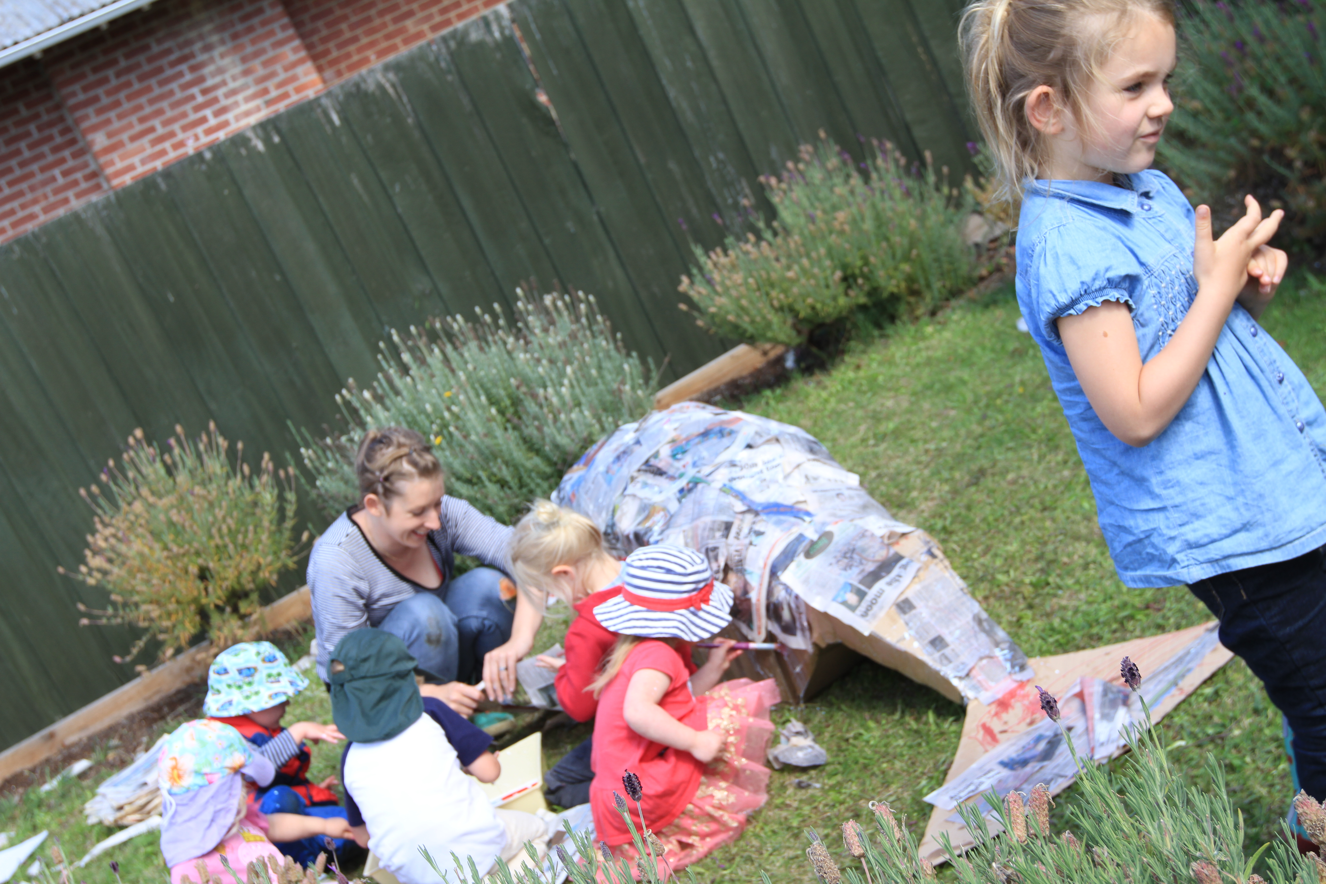 This is a not quite as big as a real blue whale, but it certainly is a monster project (unless you are working with a large group, or have an enthusiastic marine biologist on your hands, you may like to scale this one back a little – the Blue Plate Whale is a smaller one to do at home!) IMG_4661 First, fashion a ‘box whale’ from a few cardboard boxes and lots of packing tape. The exact shape of your whale will be determined by your boxes, but we found it far easier than initially imagined to make the basic whale shape. (We also used some packing to help support the inside of the shape, though this was more about what happened to be in our boxes rather than something you need to seek out.) We then had a little more ‘softening’ to do before our box looked truly like a whale. We scrunched newspaper and taped this down with sheets of paper (like wrapping a big newspaper present!). We did this in any places our whale needed a few more ‘curves.’ IMG_4649 Once the shape is achieved mix 1part water ; 1 part PVA glue in a tray. Tear paper into more manageable pieces and dip in the glue before placing over your whale. Aim to overlap your paper for strength and cover as much of the whale as possible. (Our young sculptors were not so focused on the idea of overlapping for strength, but their enthusiasm for covering the top of the whale meant that it happened anyway!) Your whaled dry time will be different depending on the thickness of your layers. Ours took about 4-6 hours to dry on a sunny day. IMG_4926 Once dry we painted our whale (blue of course!) and the squelchy squashy finger paint was a hit, as always. IMG_4930 This particular whale will then visit my 5yos Prep class soon, for a little more decoration and as they are investigating sea creatures at the moment, it will then come back to us for an under the sea birthday party, and then find it’s home at the daycare centre – not bad for a bit of news paper, a few old boxes and lots of little enthusiastic hands!